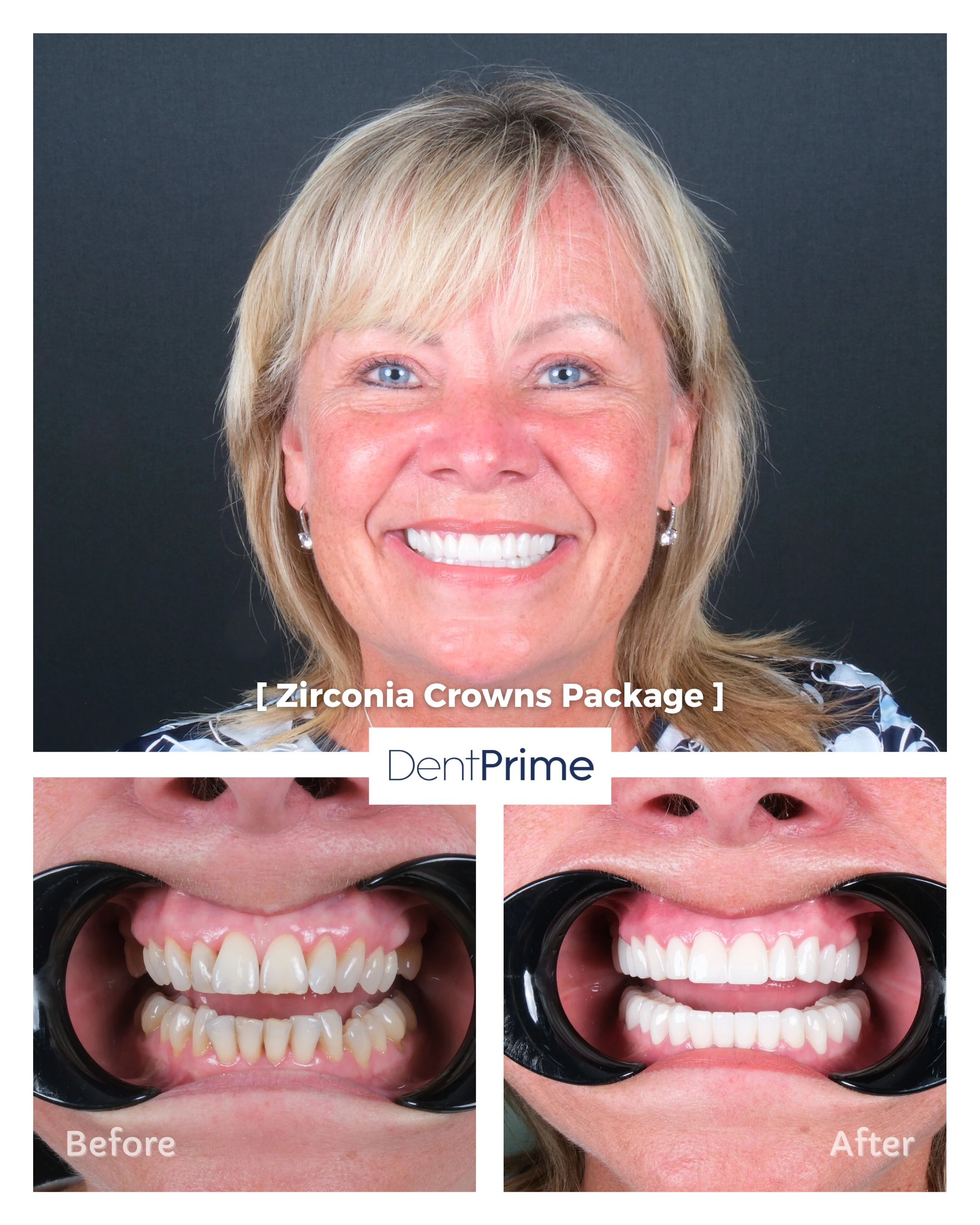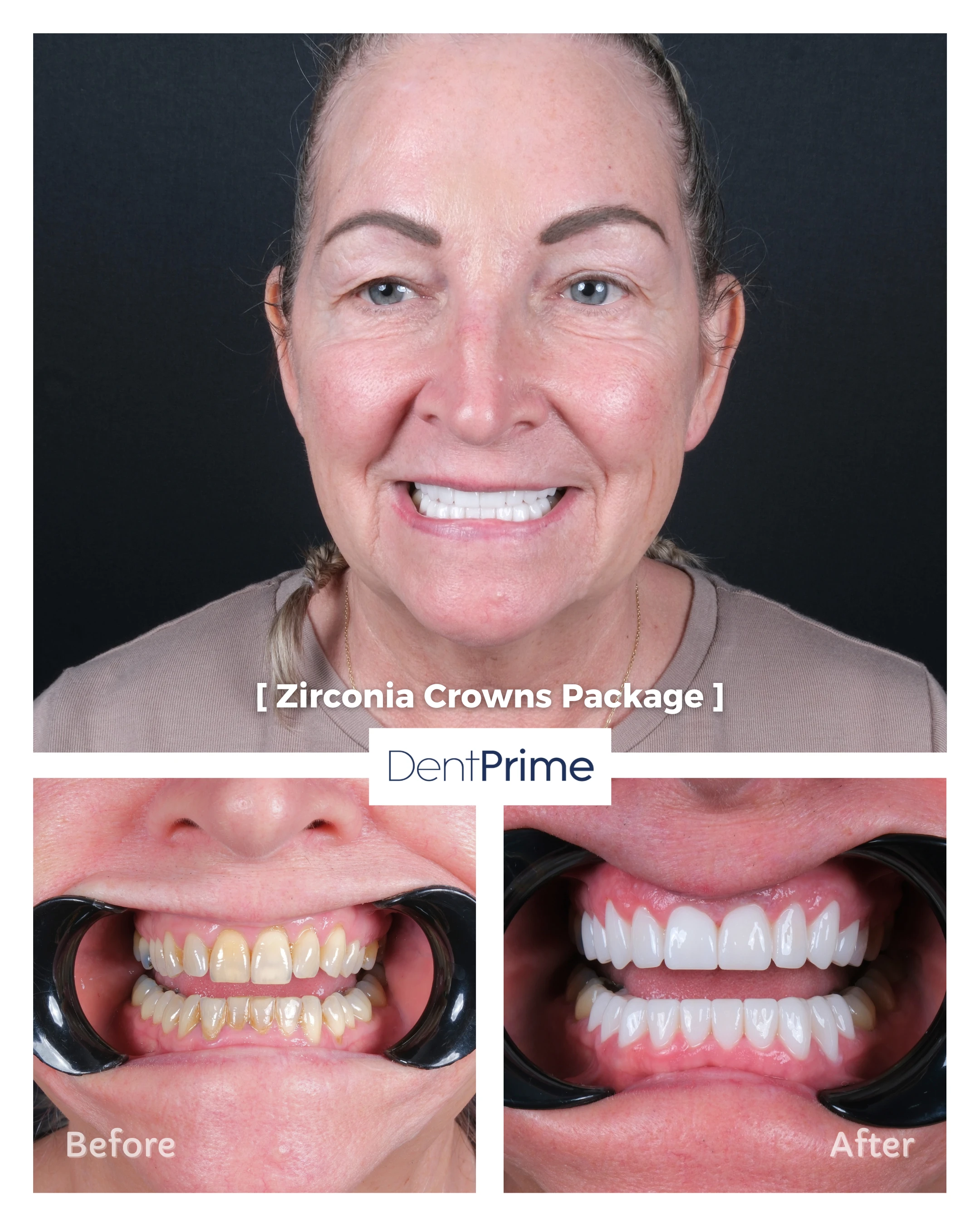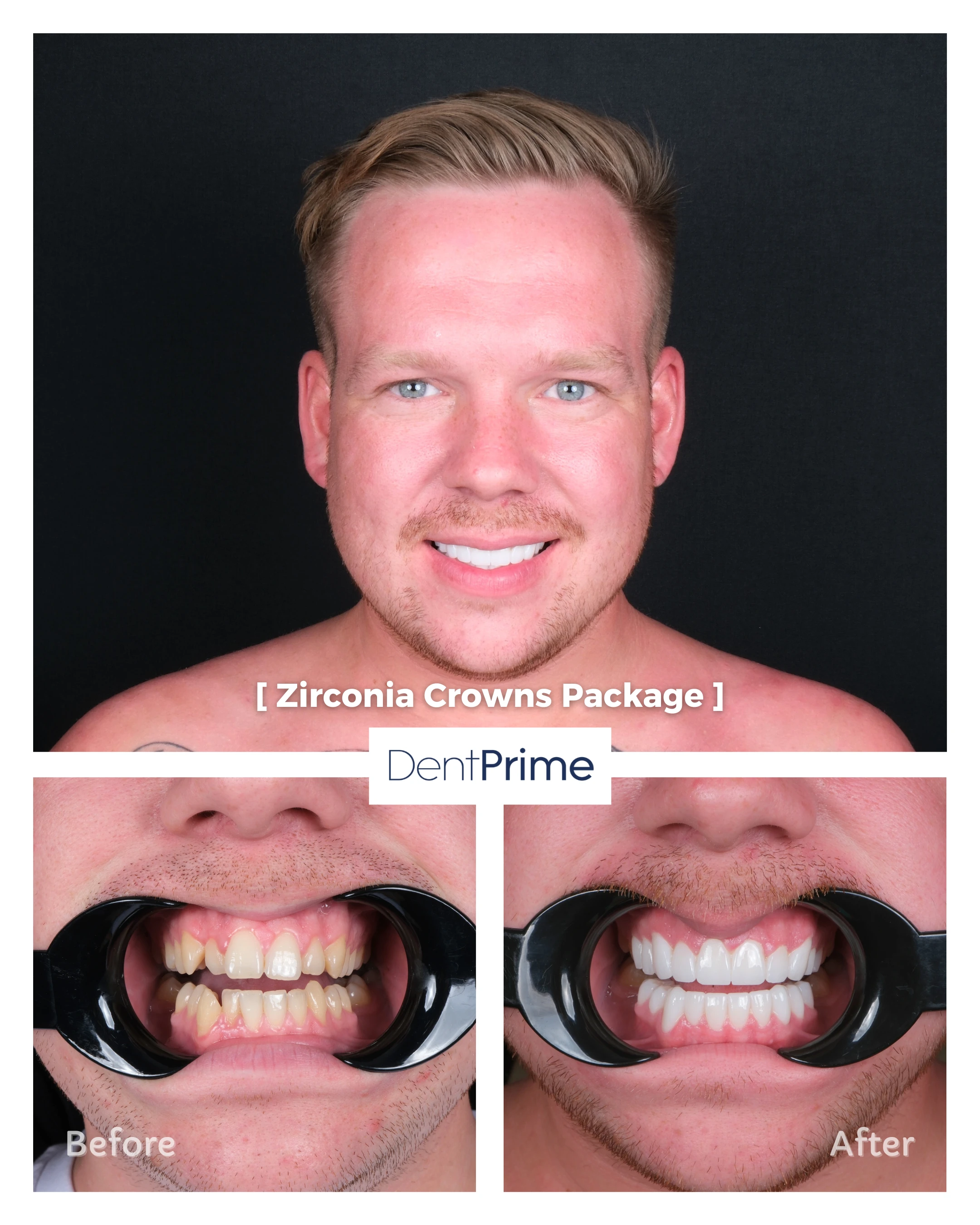 DentPrime UK’s zirconium crown packages include CBCT scans, digital planning, temporary restorations, final crowns, accommodation, VIP transfers, and aftercare support.